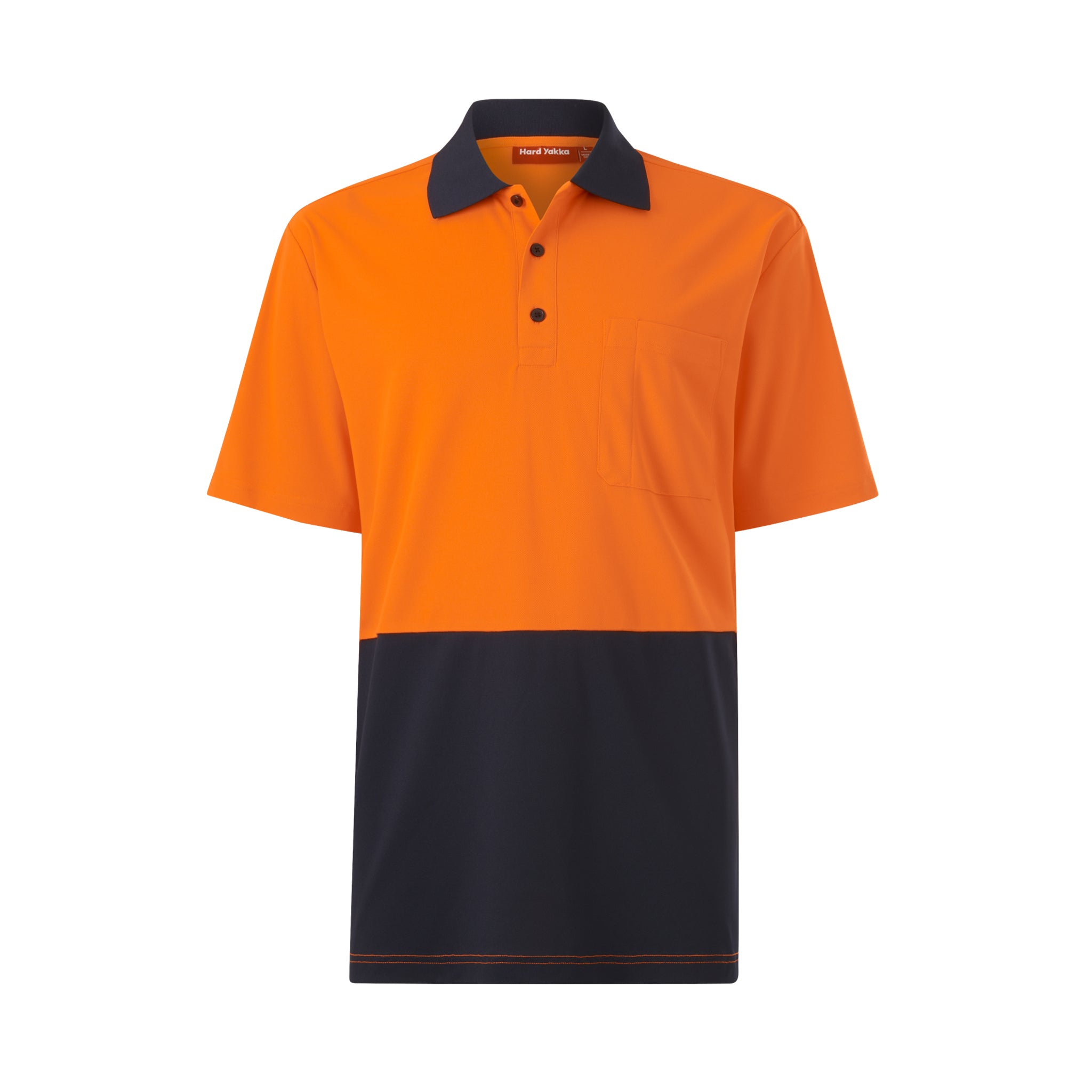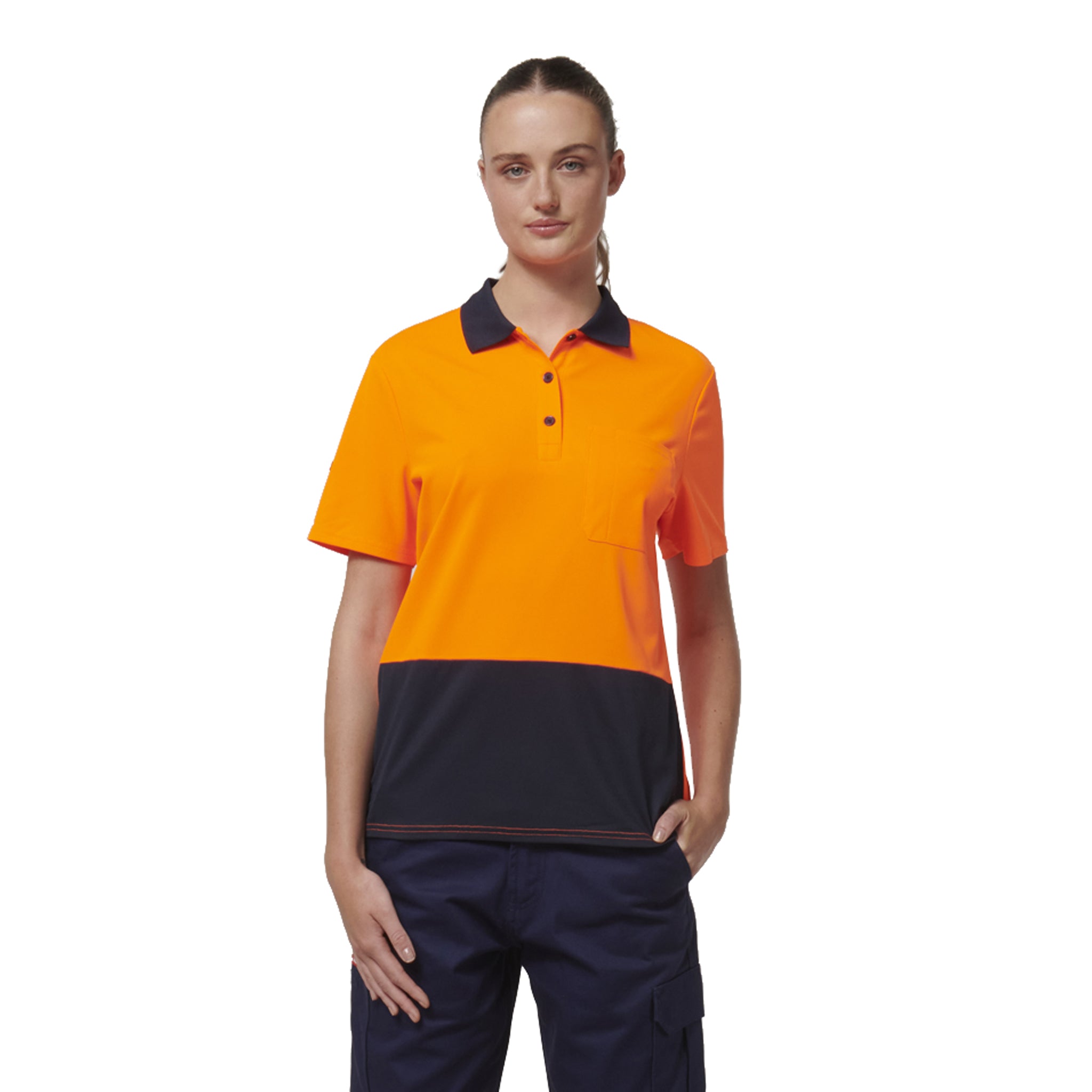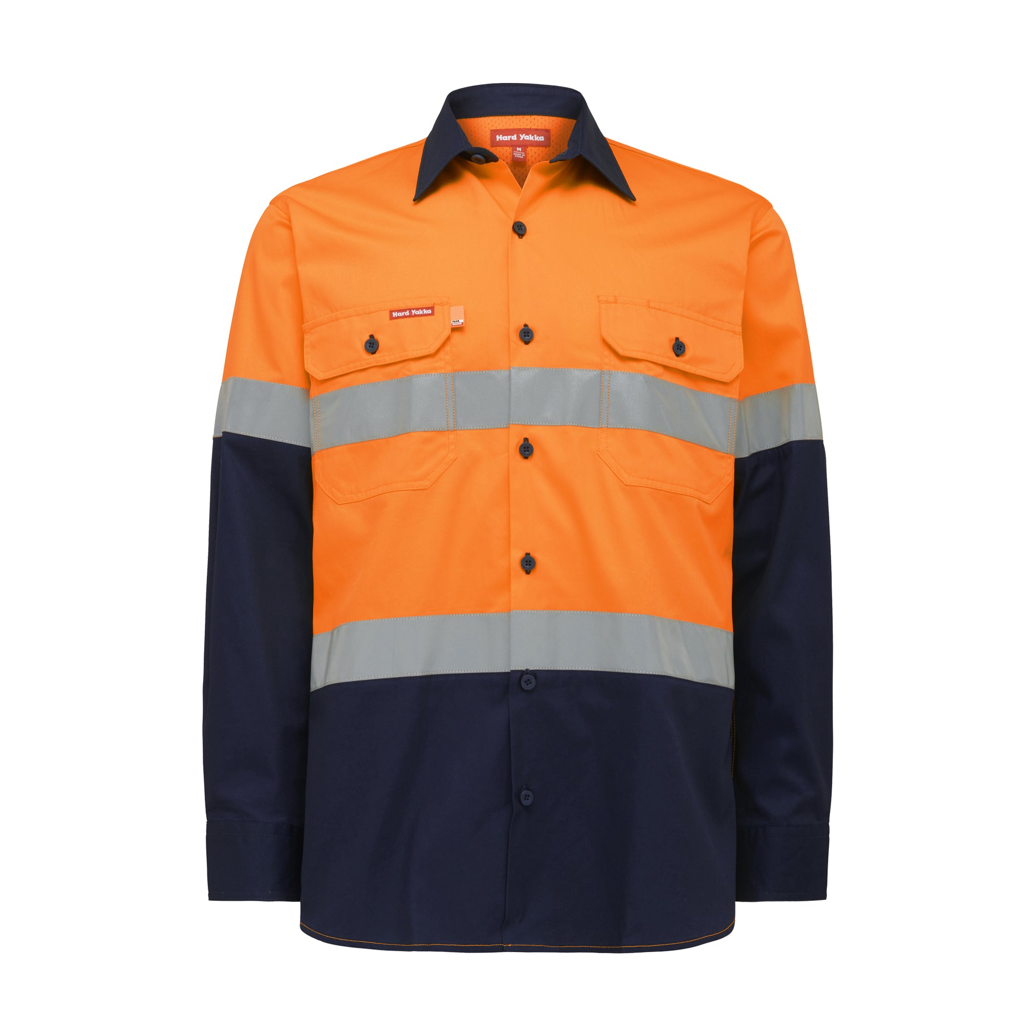 high-vis safety shirt in two tone of orange with navy blue collar and lower panel