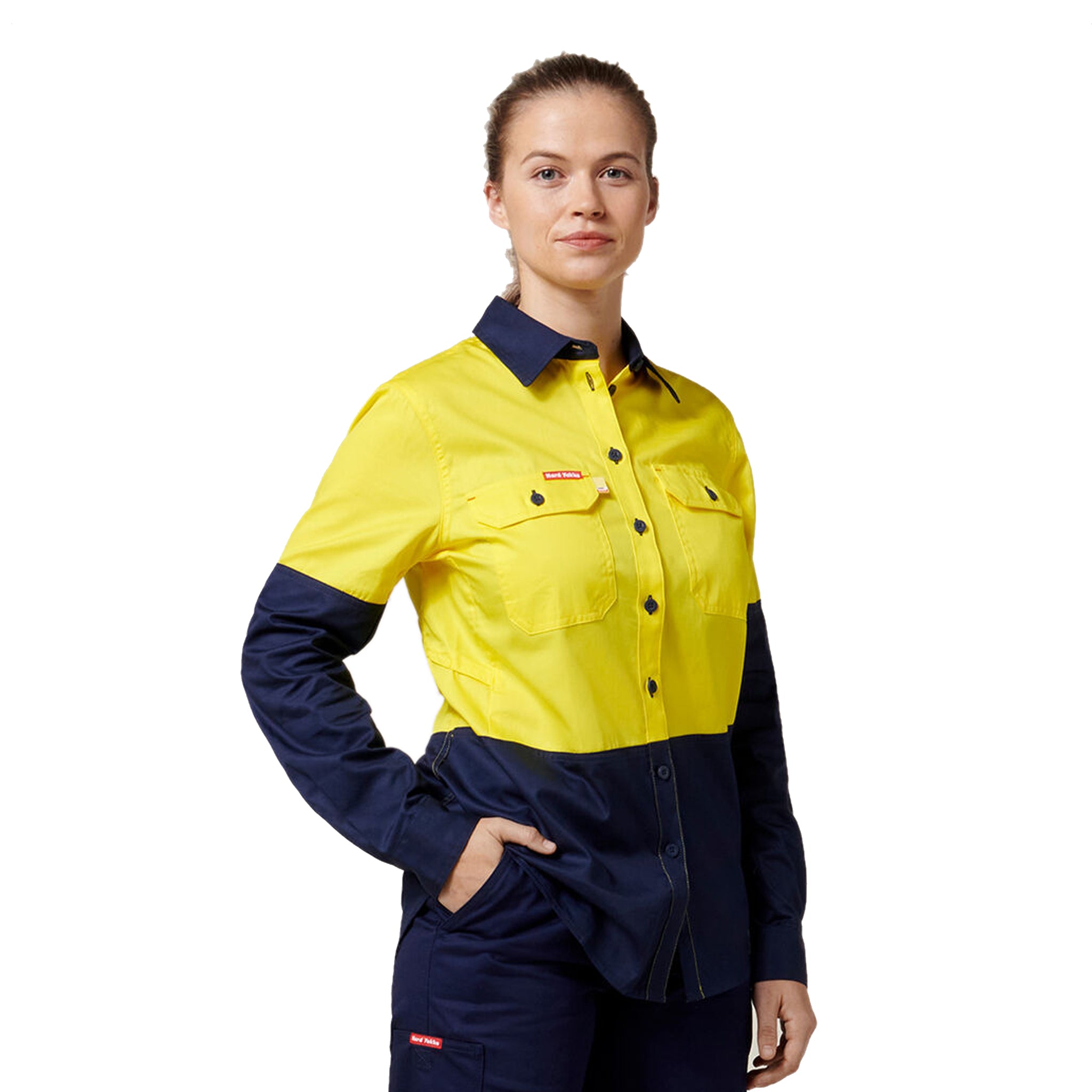 Two-tone yellow and navy high-vis safety shirt with reflective strips.
