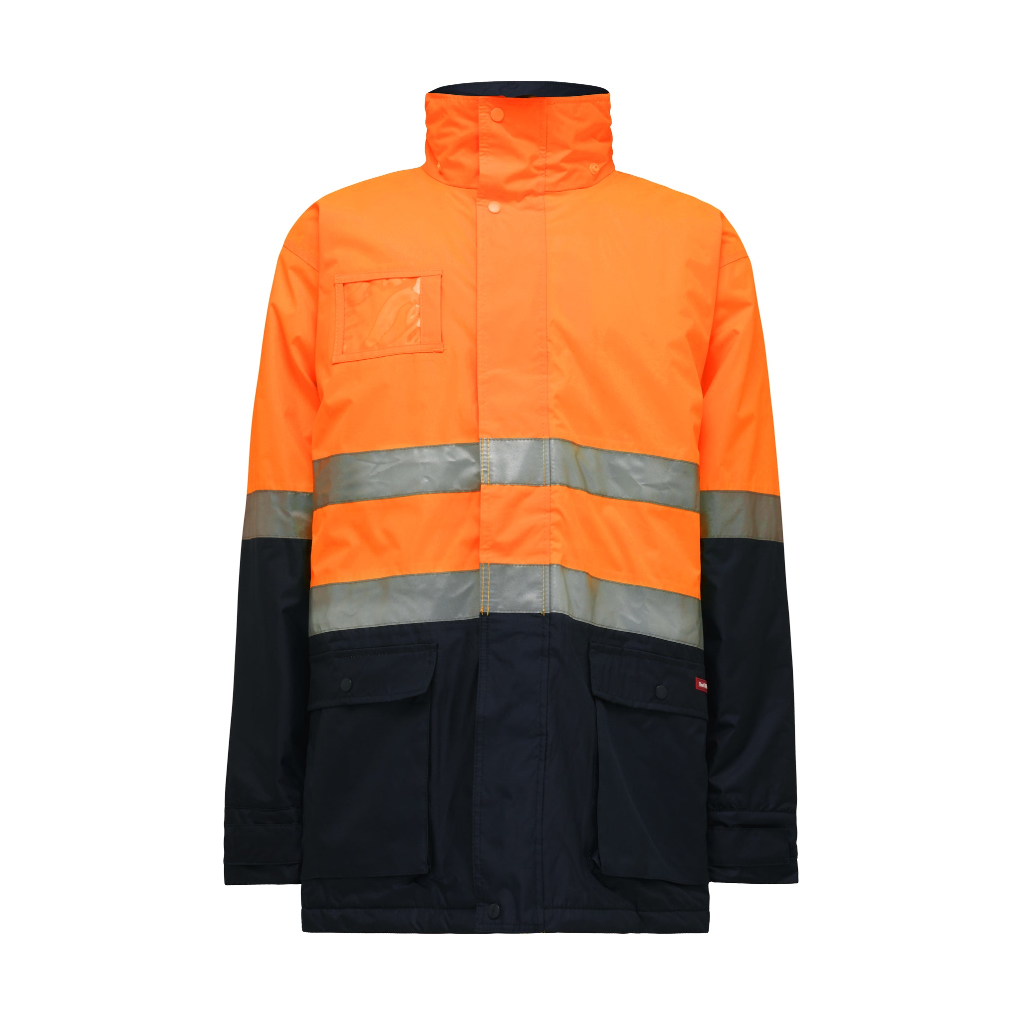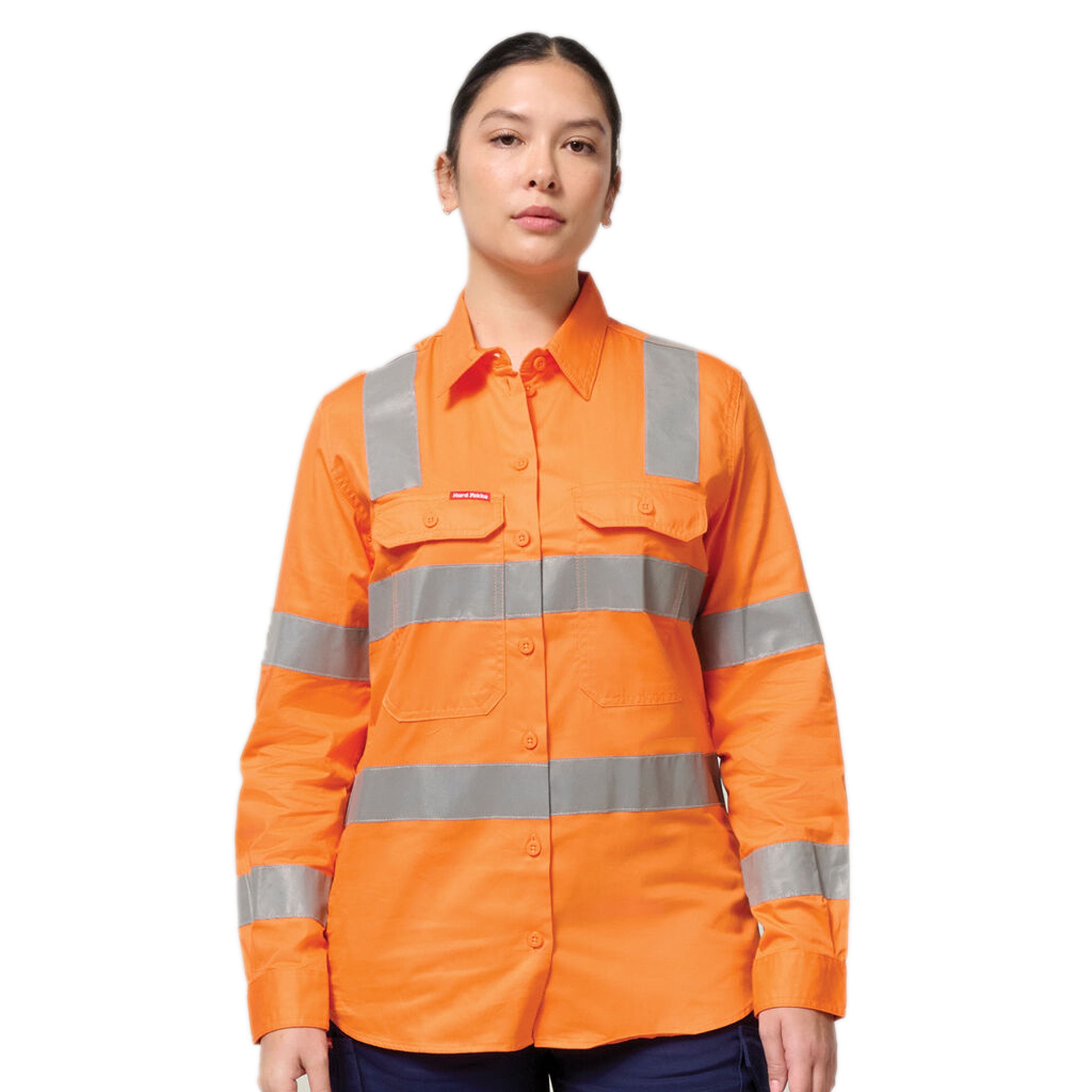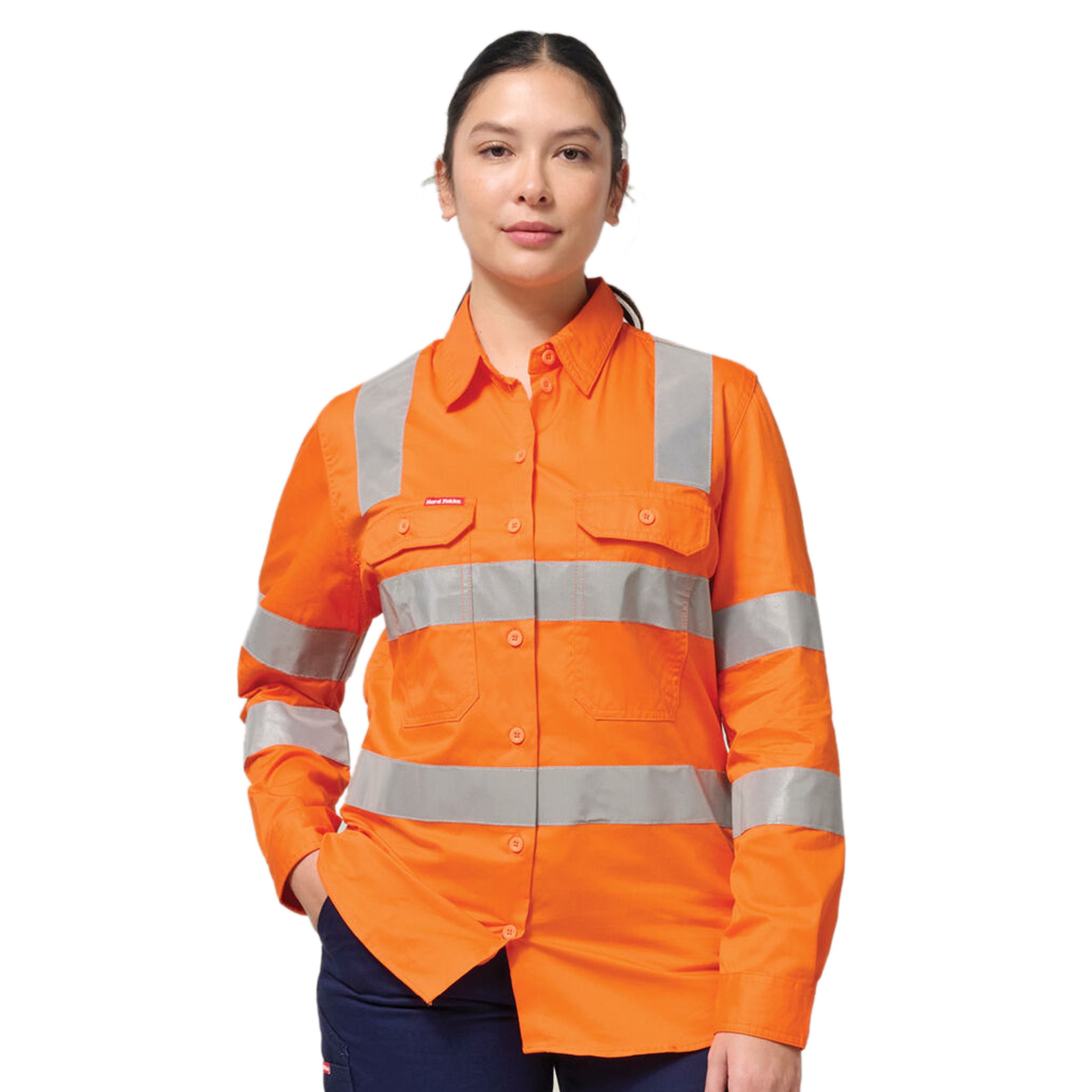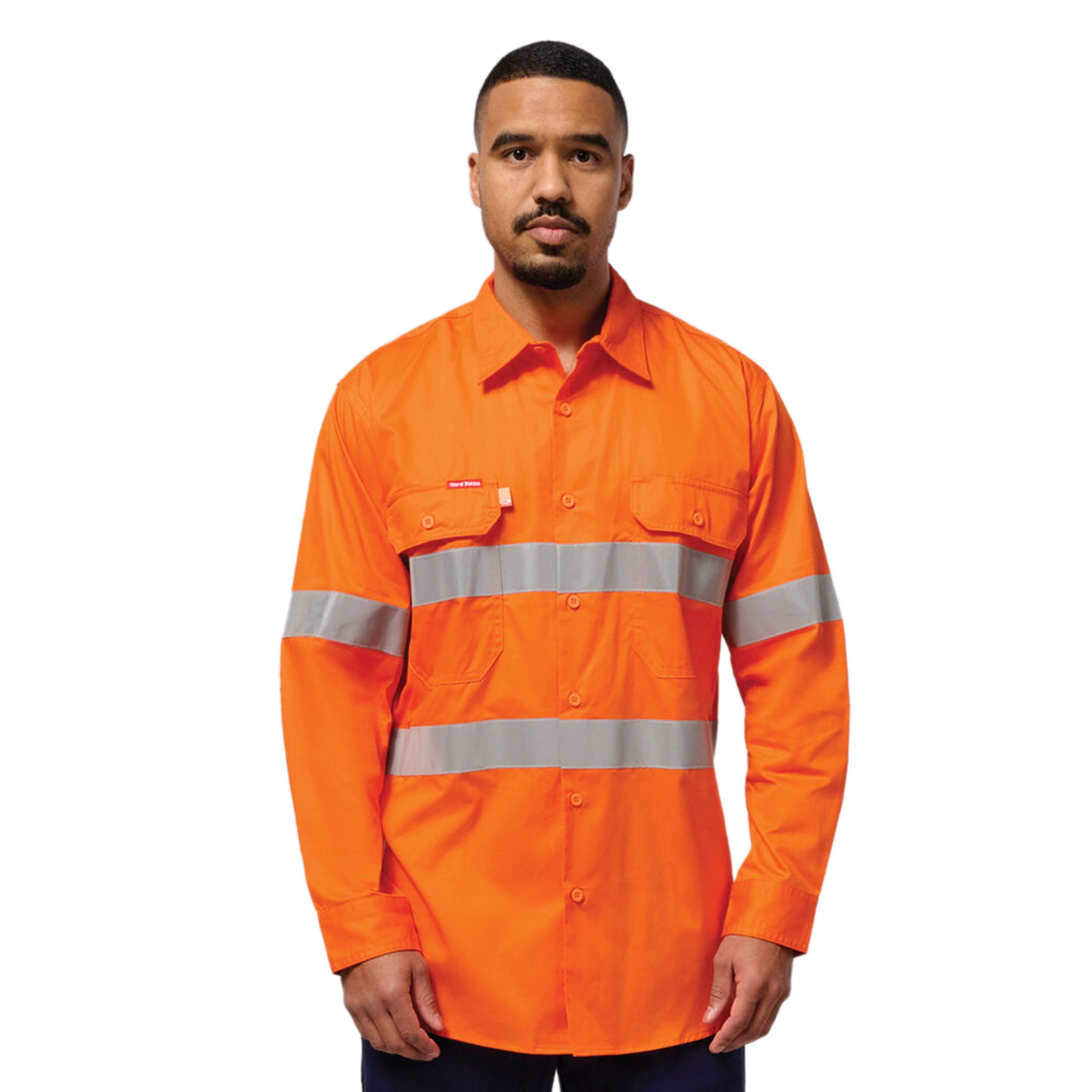 Hi-vis orange safety shirt with reflective strips and two large chest pockets.