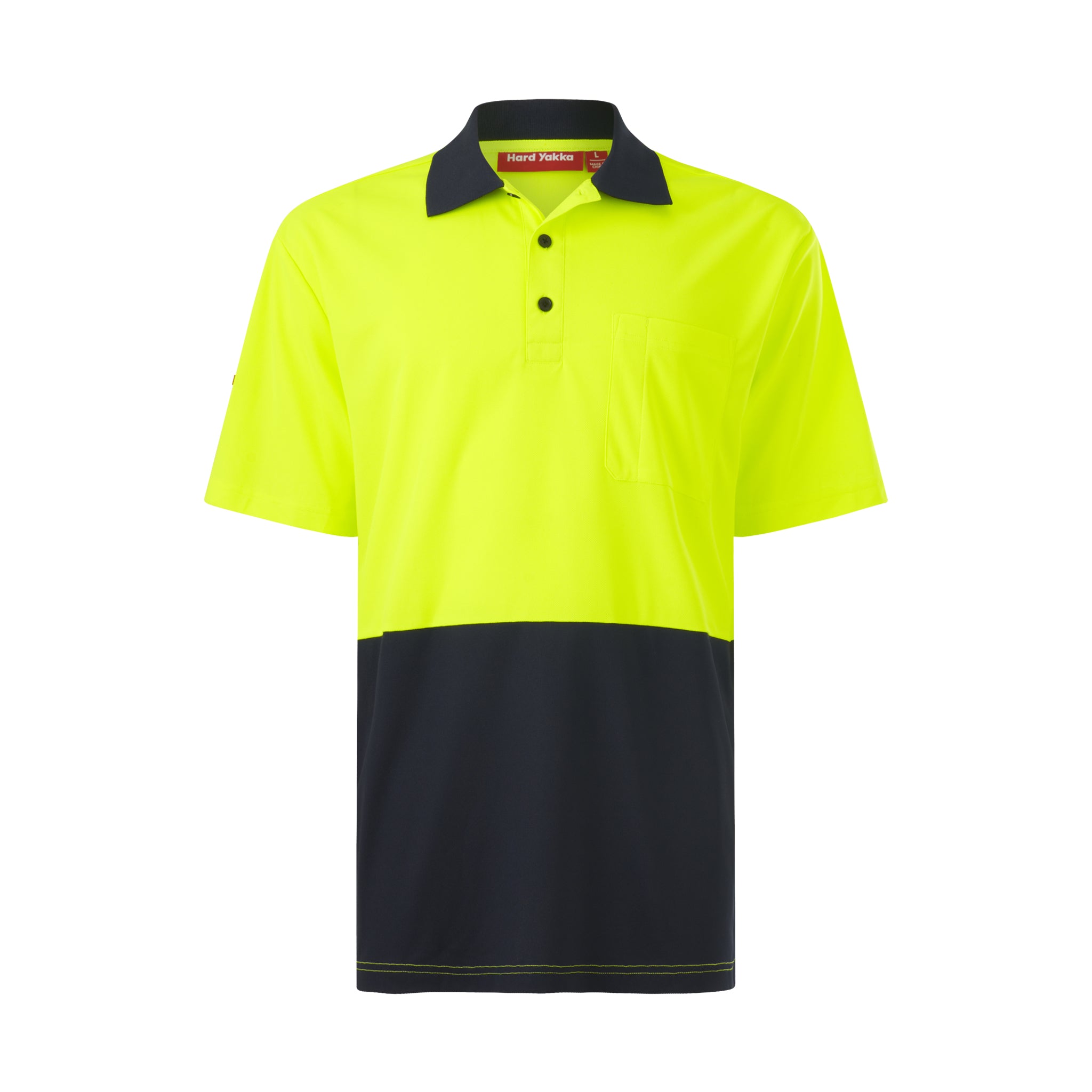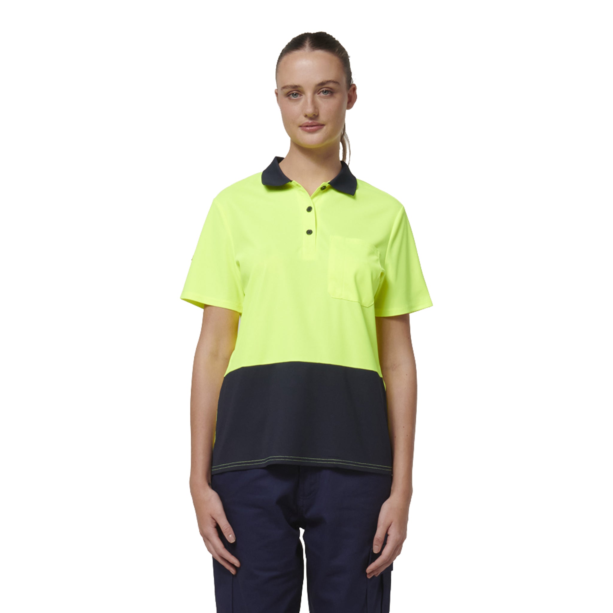 high-vis safety shirt in two tone of yellow with navy blue collar and lower panel