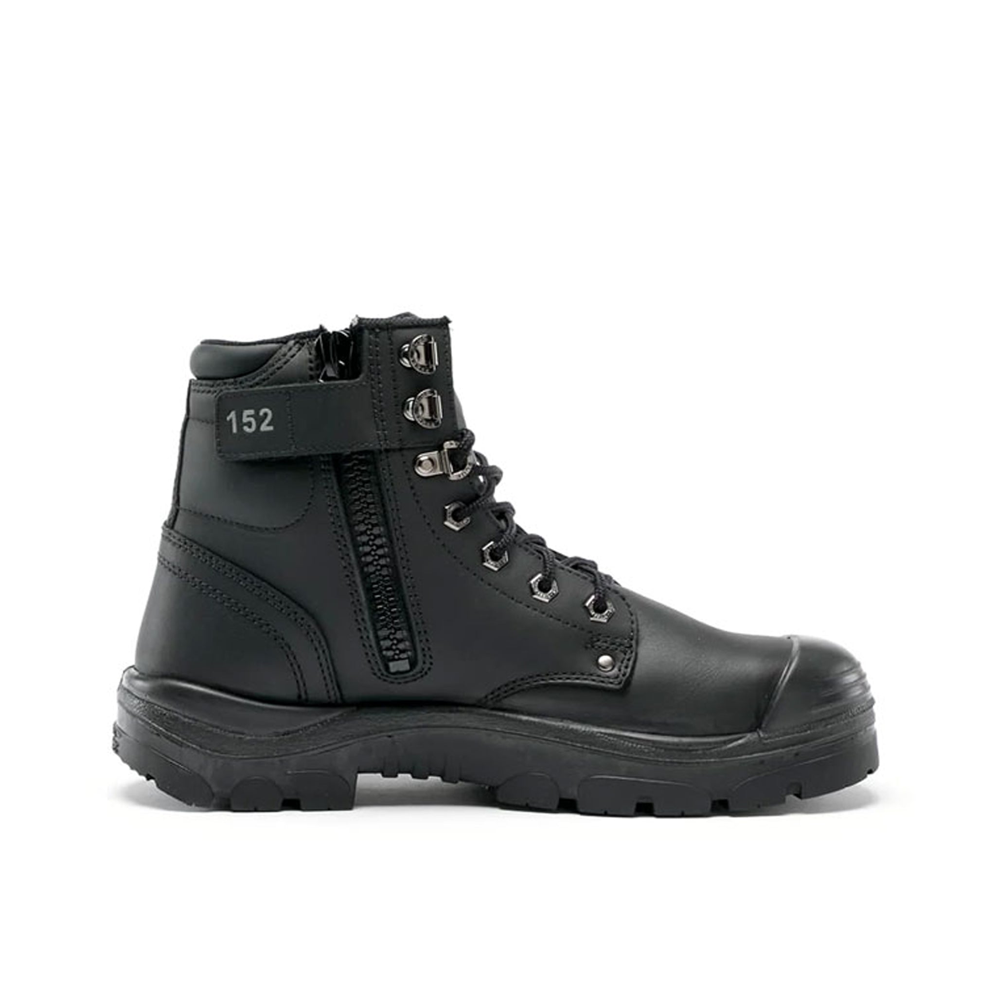 A black, high-leg lace-up work boot with a side zipper, composite toe guard, and rubber outsole.
