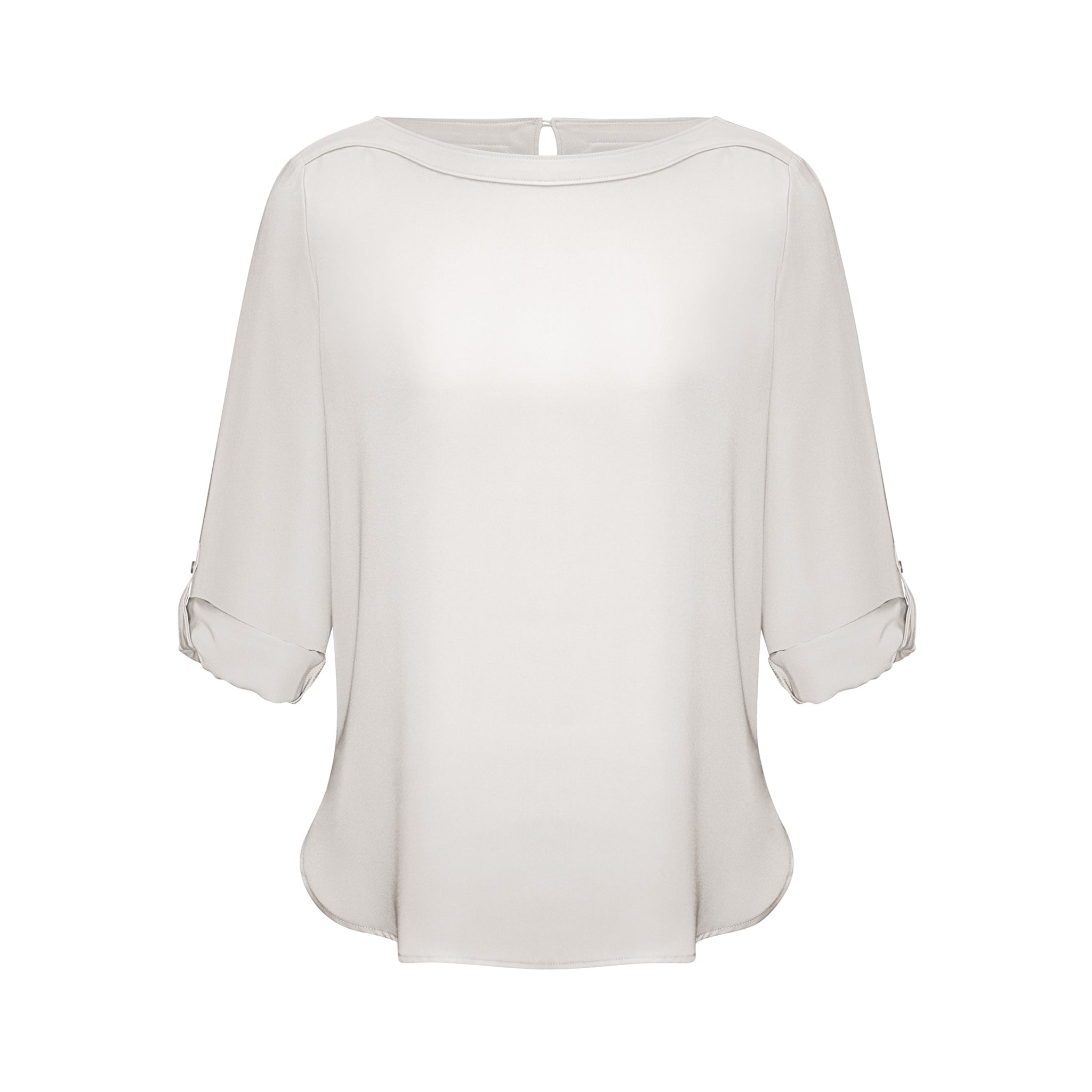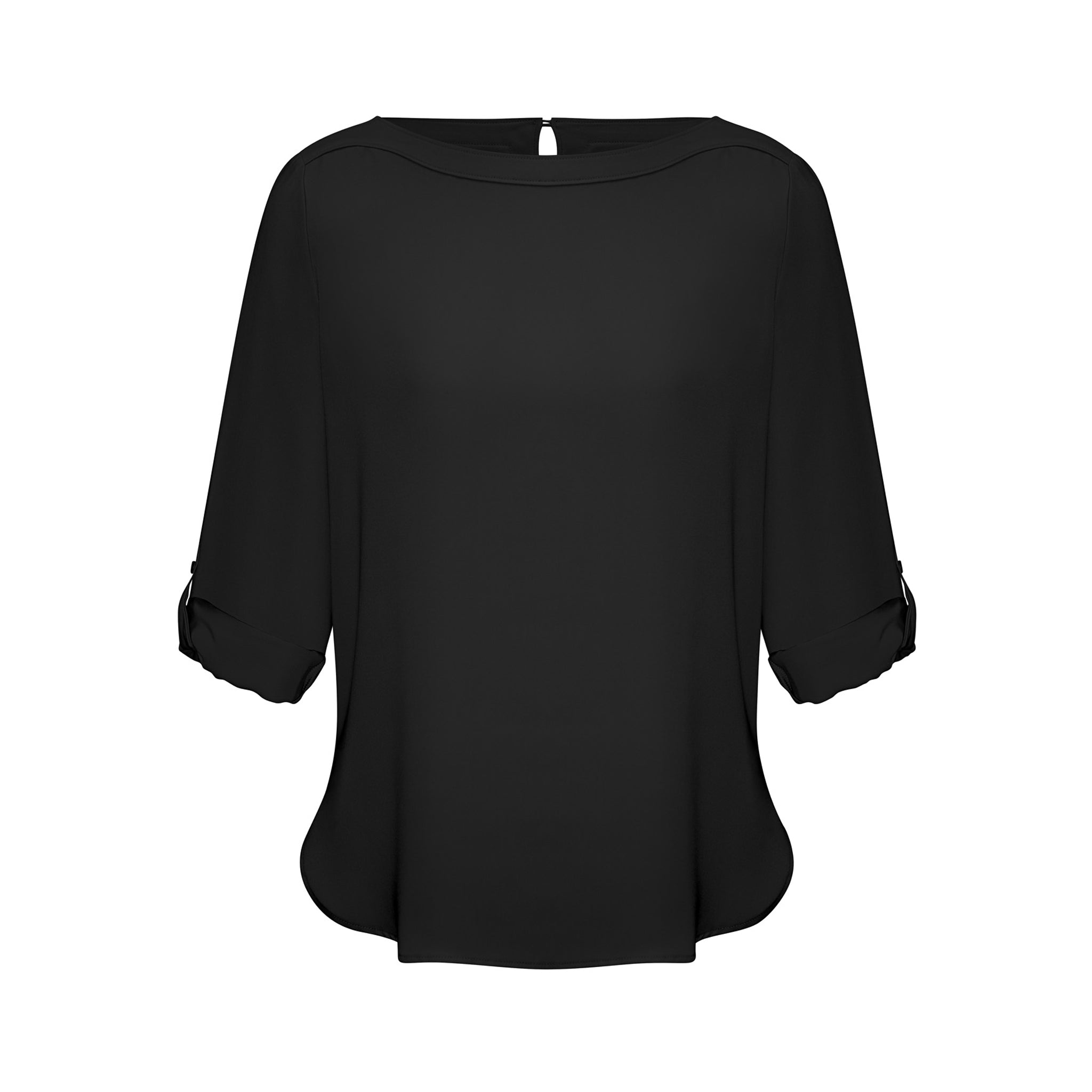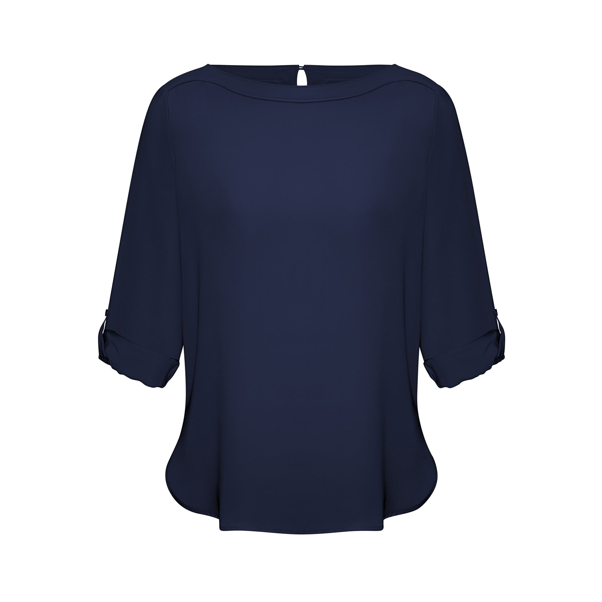 An elegant boatneck blouse adds a touch of minimalist chic to your fashionable uniform. A longer length with a stylish shirt-tail hem and functional roll-up sleeves are a practical feature for the working woman.