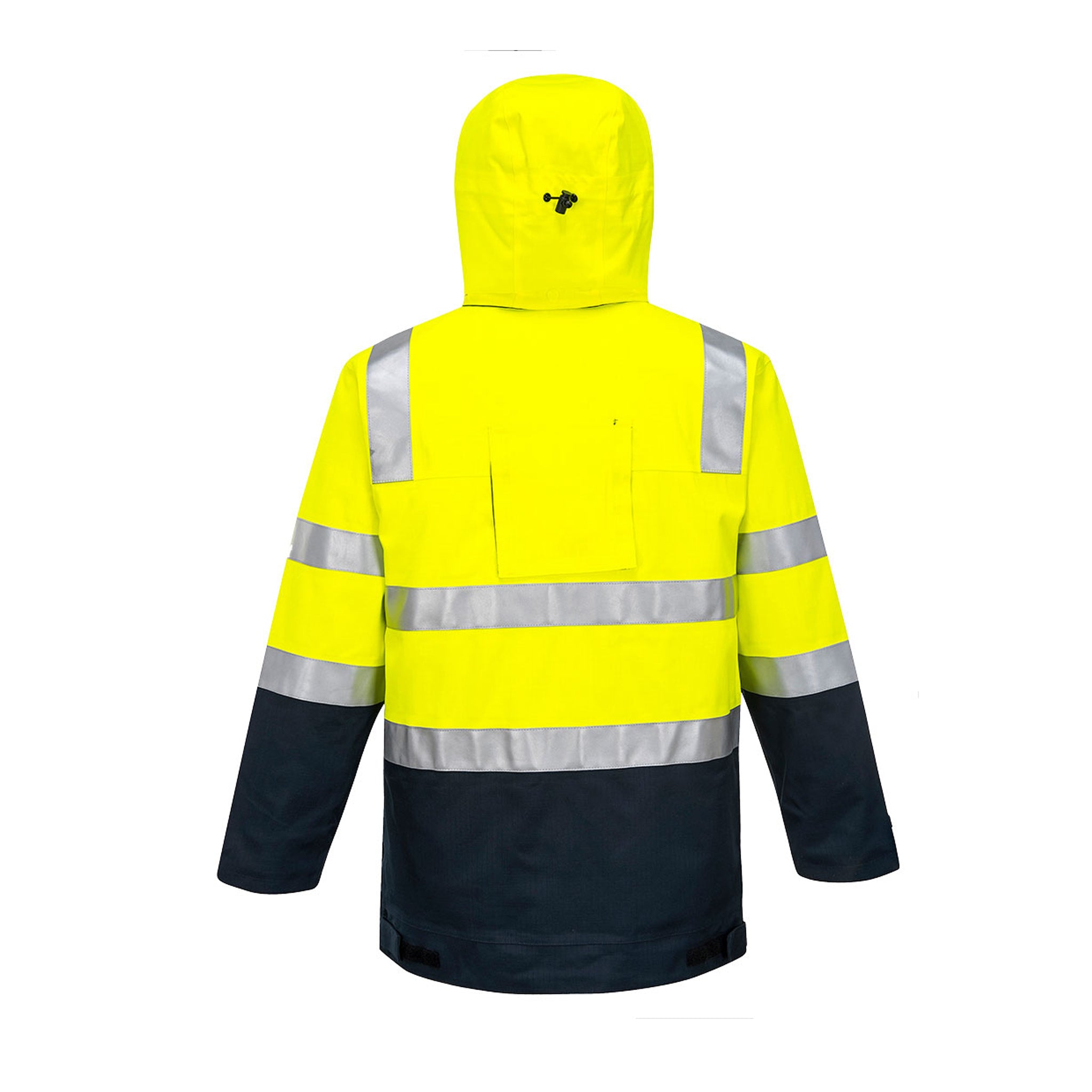 High visibility arc rated, flame resistant & anti-static longer line jacket, premium reflective tape, flame resistant cotton lining, waterproof/breathable BREATHETEC™ coating, multiple pockets concealed hood, plastic zip, elastic gusset sleeve cuff & back safety harness opening.