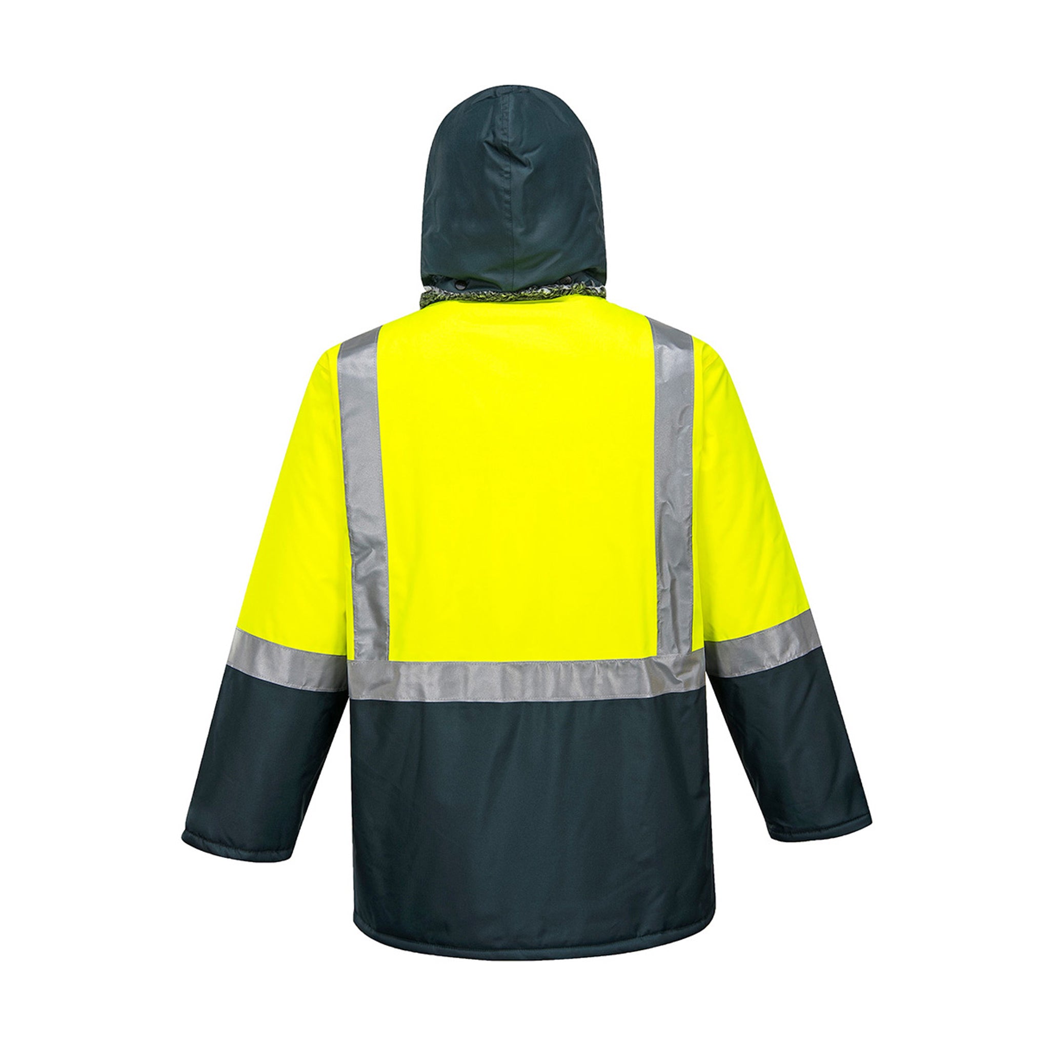Long line padded jacket with premium reflective tape, detachable hood, fleece trim and waterproof fabric.