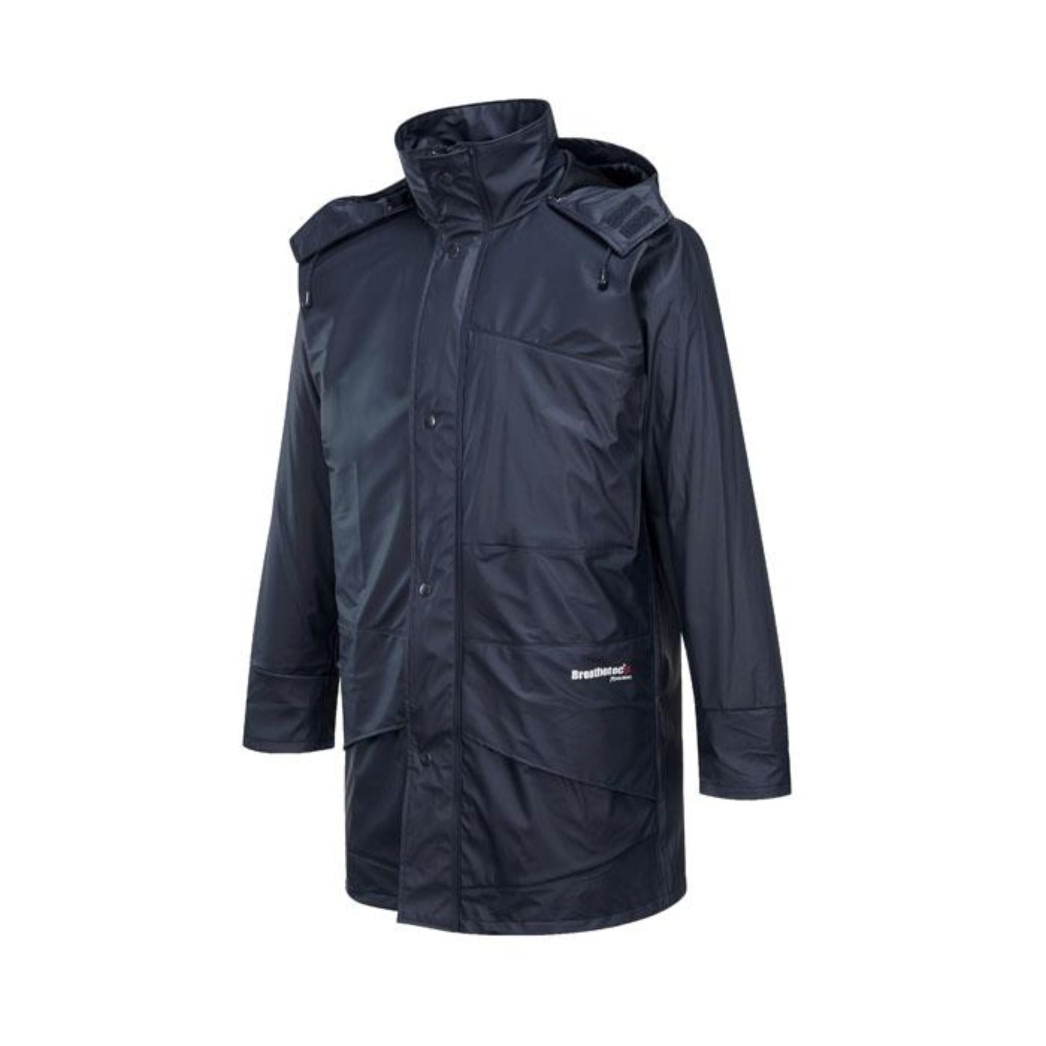 Solid colour long line waterproof/breathable BREATHETEC™ PU jacket with durable knit backing. Technical bonded windproof fabric features 4 way stretch, welded seams. Also features large front pockets, adjustable stowaway hood & storm protection collar.