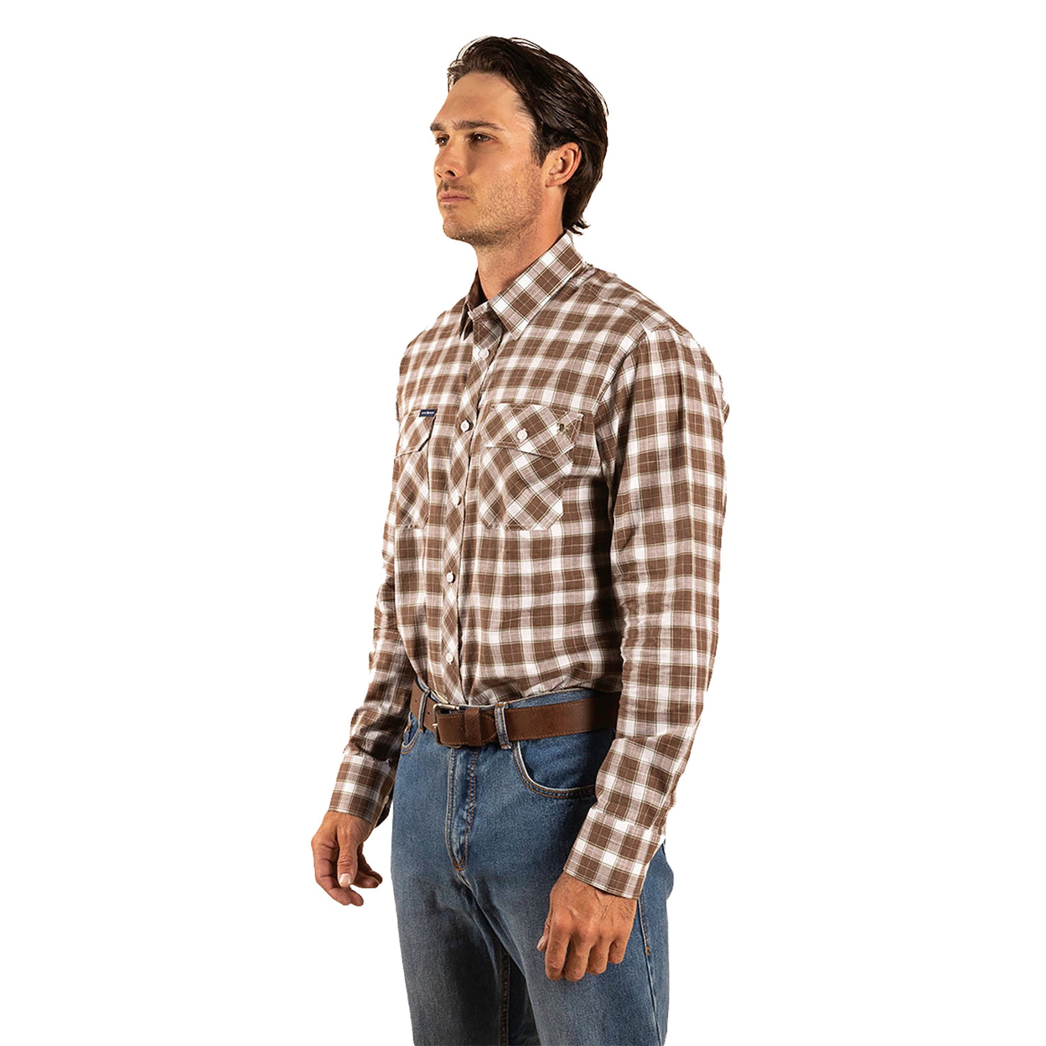The Wilson is a semi-fitted long sleeve dress shirt, lightweight and soft to the touch. It features double breast pockets, a small bull and large sleeve embroidery.
